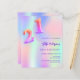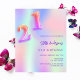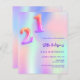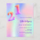 A girly and feminine 21st birthday party invitation. A rainbow, holographic coloured background in purple, pink, mint green. Personalize and add a name and party details. The name is written with a hand lettered style script, purple coloured letters. Number 21 is written with a balloon style font, script.