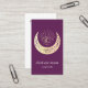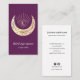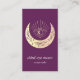 Elegant business cards in vertical layout for yoga studio, massage studios, massage therapy, meditation teacher, natural health counsellor, spas or wellness professionals feature a gold holographic illustration of a third eye over crescent moon on a impressive purple background.