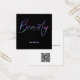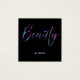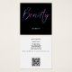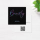 Un élégant carte de visite avec le mot "Beauté" sur le devant dans la parties scintillant holographique néon avec de l'espace sur le dos pour votre nom et les coordonnées. Cette conception inclut un code QR au dos.