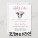 Cute farm theme girl's baby shower invitation card featuring watercolor illustration of a baby cow with a flower in her head. The text says "holy cow! we are having a baby!"
