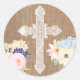 Burlap look background with Holy Cross detail in a lace effect and pretty watercolor flowers in shades of pale yellow and pale pink.