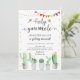 This fun invitation features watercolor succulents with gold glitter accents and colour fiesta flags.