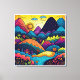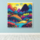 A colourful, whimsical, doodle art illustration of an abstract boho-inspired nature scene with the sun rising over vibrantly coloured mountains and fantasy woodlands. This is the perfect brightly coloured fantasy landscape image for canvas frame wall art. Create a welcoming vibe in your home by displaying this simple but beautiful decoration on your wall for someone who is engaged in nature scene.