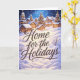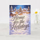 This folded greeting card captures the essence of the holiday season with a picturesque winter landscape. The cover features the phrase 'Home for the Holidays' in elegant cursive script, set against a starry night sky filled with twinkling lights. Below, a cozy wooden cottage glows warmly, surrounded by lots of fresh, untouched snow blanketing rooftops, trees, and the winding path that leads to the door.