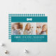 Our pet dog themed “Home for the Holidays” Christmas card features a collage of three square photos of your new puppy to share with friends and family. Personalize the text with a custom greeting, your last name or family, your pup's name, and the year. Modern teal blue design includes cute paw print, dog bone, and a coordinating gingham / buffalo plaid pattern on the back.