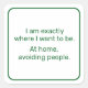 This sticker is a vibe. Use it to declare your preference for peaceful solitude. Dark green text says, "I am exactly where I want to be. At home, avoiding people." Other available colours include hot pink, dark blue, dark red, and black.