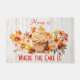 Welcome your guests with a sweet and playful touch using this 'Home is Where the Cake Is' doormat. Featuring a delightful cupcake surrounded by vibrant fall flowers and leaves, this charming doormat adds a cozy and inviting vibe to your home. Perfect for the fall season, Thanksgiving, or any time you want to showcase your love for cake and a warm, welcoming home. Add a dash of sweetness and seasonal charm to your front door with this beautiful mat.