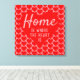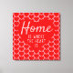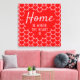 Home sweet home. An upbeat message that says "Home is Where The Heart Is". Red and Pink color theme with a large heart as the main motif. More smaller hearts form a patterned background.