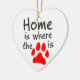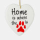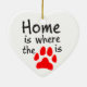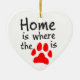 A wordplay with the quote "Home is where the heart is", this heart shaped ceramic ornament has the words "Home is where the [paw print picture] is", with the paw print picture in red, representing the "heart". The perfect gift for pet lovers.