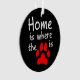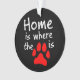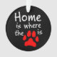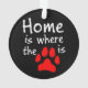 A wordplay with the quote "Home is where the heart is", this black circle ornament has the words "Home is where the [paw print picture] is", with the paw print picture in red, representing the "heart". The perfect gift for pet lovers.