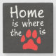 A wordplay with the quote "Home is where the heart is", this black stone coaster has the words "Home is where the [paw print picture] is", with the paw print picture in red, representing the "heart". The perfect gift for pet lovers.