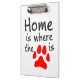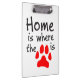 A wordplay with the quote "Home is where the heart is", this clipboard has the words "Home is where the [paw print picture] is", with the paw print picture in red, representing the "heart". The perfect gift for pet lovers. Also available in black!