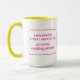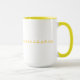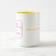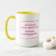 White, 15-ounce, mug with yellow handle and interior. Coordinating hot pink text says, "I am exactly where I want to be. At home, avoiding people." A decorative hot pink scribble runs around the back of the mug to complete the design. Created with right-handed people in mind.