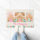Welcome everyone to your home this holiday season with this adorable gingerbread house door mat. This design features a festive Gingerbread house decorated with pink, green and white. You can personalize this door mat with a name. Coordinates with the Gingerbread Party collection.