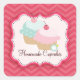 Two cupcakes, one teal and the other pink, both with a cute pink cherry on the top. Perfect for cupcake and baking lovers. Dark pink and red chevron pattern on the background, featuring a pink label written as model "handmade cupcakes", which can be easily customized with message, name or any other text of your choice.
