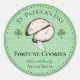These personalized green St. Patrick's Day Fortune Cookie sticker labels feature a fortune cookie and lucky green clovers hand-drawn in black ink, a fun "Lucky You" background text pattern and text that is 100% editable.