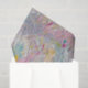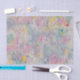 Homemade paper made with recycled paper and other items including paper pulp in pinks, purples, yellows, blues and greens. Unique texture shown in scanned handmade paper image.