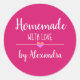 Modern "homemade with love" sticker with a white font on a pink background embellished by a cute heart. Customize text.