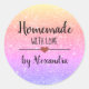Modern "homemade with love" sticker with a black font on a rainbow glitter background embellished by a cute red heart. Customize text.