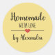 Modern "homemade with love" sticker with a black font on a green background embellished by a cute red heart. Customize text.