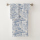 Un pastoral toile de jouy motif de maisons, d'arbres, de rivières et de gens se marient pour confectionner un joli et élégant ensemble de serviettes.