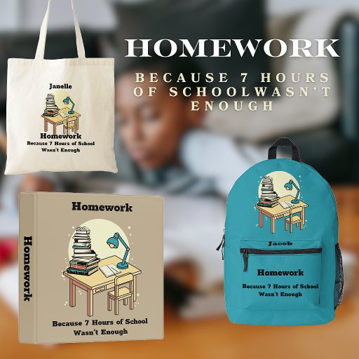 Homework: Because 7 Hours of School Wasn't Enough text paired with your name and a desk piled high with books you have to read and write a report on.