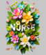 Un arrangement floral dynamique encadre le mot "INFIRMIÈRE", célébrant la compassion et le soin de la profession. Des fleurs aux couleurs vives et une végétation luxuriante soulignent le rôle essentiel que jouent les infirmières.