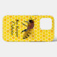 Honey bee themed phone case done in a yellow and orange honey comb pattern. Graphics of a large honey bee, decorates the middle. Personalize all the text to suit your needs.