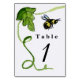 Art features a watercolor of a green vine with a leaf. A picture of a buzzing honey bee is above the table number. Words note "Table 1" but can be personalized with your own words and messages. Create your own unique one-of-a-kind table card design by customizing these template garden bugs insects cards for your wedding, reception, or other personal event information.