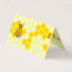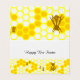 Folded custom business cards with retro script and block letters over a background of honeycomb with happy buzzing bees and honey.