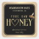Simple and dramatic label with gold gradient border and a a flying honeybee on black background. A gold heart is substituted for the letter “O” in the word HONEY.