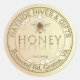 Your apiary name is displayed in a curved edged border along the top of label with the location along the bottom edge of label. The word HONEY is written in a beveled metallic font and the text is reflected and faded beneath the word. Honey net weight appears below the label in ounces and grams. A stylized gold honeybee and delicate honeycomb pattern surrounds the word HONEY.
