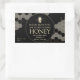 Eye-catching label for your large honey jars. Modern stylized yellow-gold bee with capped honeycomb on a black background.