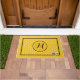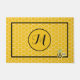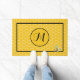This doormat features a yellow and white honeycomb pattern. It has a black border and an area in the centre for a monogram. In the lower right corner there's a bumble bee.