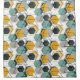 Honeycombs. Abstract geometric pattern. Grey, mustard, turquoise figures on white.