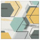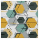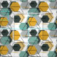 Honeycombs. Abstract geometric pattern. Grey, mustard, turquoise figures on white.