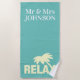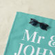 Honeymoon beach towels for Mr and Mrs newly weds. Elegant wedding gift idea for just married couples. Teal blue or custom background color with palm tree graphic. Upload your own image optionally. Create one for him and her. Great for summer wedding destinations, beach, pool and more. His and hers presents for new husband and wife.