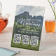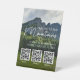 This alternative wedding registry Honeymoon Fund sign features the caption "Take us to the mountains" in modern white fonts over a mountain landscape picture background. Easily change the background photo with one of your choice, and add up to 3 QR Codes to invite your guests to make a contribution to your dream vacation by sending cash donations to your payment app with their mobile phones.