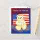 L'ours en peluche couleur crème est assis contre le drapeau américain. Il a une larme dans l'oeil et tient la patte au coeur. Lightning in arrière - plan. illustration de T.A.Paxton de Starhorsepax, Brosses Lightning par obsidiandawn.com. Une carte postale pratique pour envoyer un ami en l'honneur de toute fête nationale honorant les héros américains.
