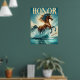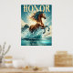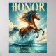 A stunning chestnut horse, mane flowing, charges through clear turquoise water, radiating strength and beauty. Sunlight glistens off the splashes, creating a dynamic and vibrant scene set against a tranquil blue sky with gentle clouds. At the top, "Honour" stands boldly in elegant yellow script, symbolizing dignity and courage. Beneath the horse, Aristotle's inspiring quote — "Dignity does not consist in possessing honours, but in deserving them." — is gracefully displayed in yellow font, with his name in smaller print. Framed by sleek black borders, this poster celebrates freedom, strength, and resilience.