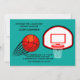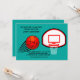 A brightly coloured, teal, invitation featuring a basketball aiming for the net. Perfect for your hoopster's celebration. (VTZY)