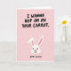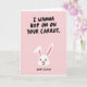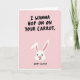 This card features a blush-pink background with softly roughened edges along the top and bottom, like textured paper. Centered is a simple white bunny head 🐰 with long upright ears shaded pink inside, a tiny bright-pink nose, and small dark eyes that give it a sweet, inviting look. The bunny’s gentle expression and forward-facing pose add a flirty, friendly tone, as if it’s leaning in for a teasing compliment. Across the upper half, large black all-caps lettering reads “I WANNA HOP ON ON YOUR CARROT,” set in a casual hand-drawn style that feels a bit cheeky against the soft colors. Near the bottom, “HAPPY EASTER” appears in the same black lettering, smaller and centered to balance the layout. The limited palette—pink, white, and black—keeps the focus on the bunny and the humorous message, with a light spring touch 🌷. The top and bottom edges look slightly uneven and grainy, framing the centered bunny face and stacked text.
