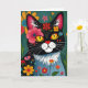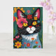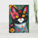 A get well card for a friend or family member. A black and white cat surrounded by colourful flowers. Inside is a cute cat pun that says, "Hope you are feline better." The inside page also has a colouring page.