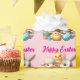 Add a lighthearted touch to Easter parties with this colourful AI-generated Easter gift wrap, which features an adorable bunny, lamb, and pair of chicks painting Easter eggs in a spring meadow, accompanied by the punny expression "Hoppy Easter". Customize messaging as desired.