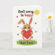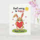 This card shows a light-brown bunny-like character standing on a narrow strip of green grass, smiling with rosy cheeks and bright, friendly eyes 🐰. One long ear is topped with a white bow dotted in soft pink, adding a gentle, flirty touch to the pose. The character hugs a large red heart close to its chest, as if offering it to someone special with a tender, reassuring look. Near the top, the phrase “Don’t worry, be hoppy!” appears in mixed black and red lettering, spaced above the character on the white background. In the upper right, a simple yellow sun with short rays adds a sunny corner accent, while small fuchsia hearts drift around like little love notes. Along the bottom, “Happy Easter!” is written in green text that sits just above the grass line 🌷. Scattered fuchsia hearts float across the white backdrop, with the brightest cluster near the bunny’s raised ear and bow.