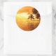 Round photo sticker with a horizontal palm tree hanging over the water of the pacific ocean during sunset on a tropical island.
