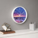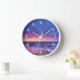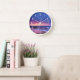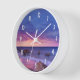 Une horloge avec une belle photo aux couleurs saisissantes de violet, bleu et rose au coucher du soleil. Un joli littoral parsemé de rochers.