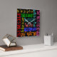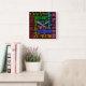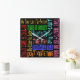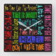 Une horloge murale vraiment unique avec différentes phrases sur le temps. comme, "Le temps vole" ou "Le temps est de l'argent", et ainsi de suite, chacun dans une lettrage différente dans des couleurs très vives sur le noir. Des points bleus marquent les heures.