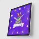 A clock with a typographiy design with rainbow peace sign with fingers raised up in a V. Text says 100 % groovy in a funky font. Psychedelic hippie theme design. Awesome purple background with faint lotus designs.