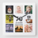 Une horloge murale en cadeau pour un 70ème anniversaire pour un gars, célébrant sa vie avec un collage de 8 de vos propres photos. Modèles pour un nom, 70 ans et une date. Date de naissance ou date d'anniversaire. Lettres de couleur noire. Arrière - plan blanc.